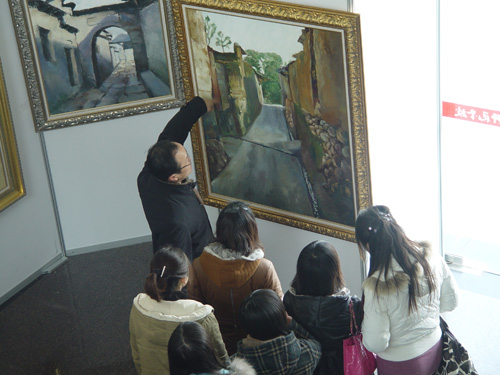 1月8日 ,我校在综合楼底楼大厅举行了2004级艺术(3)班“大印象·秋到丽水”油画作品展开展仪式。这次展览共展出39幅油画作品,均取材于浙江丽水,是这个班39名学生的毕业创作。作品从不同角度,以不同形式展现出丽水的美丽风光。同学们以青春的热情、学生的豪气大胆挥洒构想,呈现出一幅幅或用色绚丽,或视角独特,或意味俊逸,或朴实含蓄的超大画作,其扑面的意趣风情和形体规格打动了所有到场的观众,大家禁不住发出一声声由衷的赞美。
