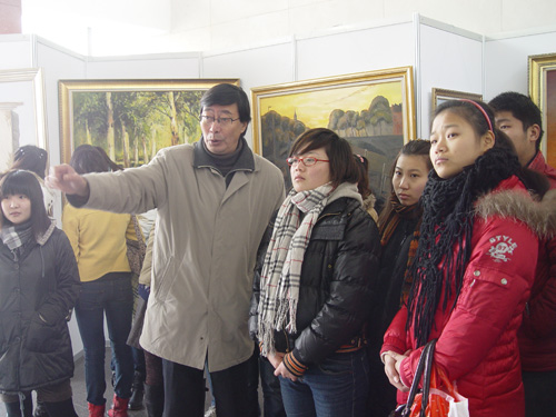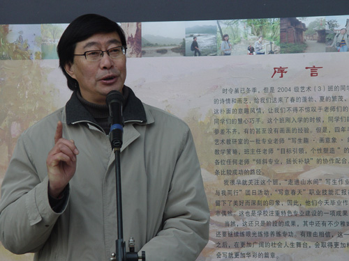 以一个班的规模,集体展现出一批如此高质量的画作,这在我校还是第一次,因而受到学校领导的高度重视,专门为这次画展举行了隆重的开展仪式。前来参加仪式的有南通市美术家协会主席、南通书法国画研究院院长侯德剑,南通市美术家协会副主席、南通大学美术学院院长吴耀华,南通大学美术学院副院长徐卫,南通书法国画研究院副院长楼传兴等领导,还有纷纷从各地赶来的学生家长。仪式上,副校长沈行恬代表学校对这次油画作品展的开展表示祝贺,对同学们四年多来的专业成长给予了充分的肯定。参加画展的学生代表盛林、辅导老师陈彤以及家长代表朱海宝相继发言,表达了他们的感慨。最后南通市美术家协会主席、南通国画院院长侯德剑先生发表了热情洋溢的讲话。他说,这是他今年所看到的第一场富有朝气和巨大发展潜力的画展,他相信,在这样一个具有百年文化底蕴的学校,会创作出更多的大手笔的更精致的作品,会产生更多的美术专业人才。