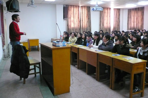 3月24日下午三点半,南通高师英语角首次活动在综合楼三楼开课教室举行。现场气氛热烈,整间教室座无虚席,同学们热情高涨。由外语系承办的此次英语角活动特别邀请了05级英语一班薛敏敏同学主持,韦博资深教师Roger为特邀嘉宾。此次活动分讲座和互动两个环节进行。一个小时的活动期间,外教风趣的讲解、主持人默契的配合、同学们积极的参与均给人留下深刻的印象。由韦博赞助的抽奖活动最终将活动推向又一轮高潮。本次活动旨在调动学生们开口讲英语的热情,从而实现学生们从“想说”到“敢说”的迈进,最终完成由“敢说”向“能说”的跨越。