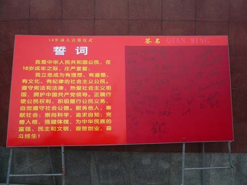 当天下午3:30,全体师生列队来到庄严肃穆的纪念碑前,默哀、献花圈、致悼词。随后,由王风雷同学领誓,62名年满18周岁的同学面向纪念碑,庄严宣誓,郑重签名,立志承诺将担负起建设祖国,服务社会的重担。在成人仪式上,季奔同学代表所有宣誓学生感谢老师在他们成长中付出的辛劳,立志要成为一个有理想、有道德、有文化、有纪律的社会公民;陈情副校长发表讲话,勉励同学们志存高远,理想远大,把服务人民和奉献社会作为人生的最高价值,成为一个有益于社会、有益于人民的人;刻苦钻研、勤奋学习,掌握为人民服务的本领,真正肩负起报效祖国的历史重任;积极投身实践,在实践中成长,在实践中成才;努力提高自身的综合素质,共建南通高师的美好明天。