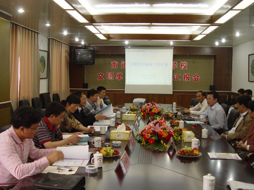 5月18日 下午,由南通纺织职业技术学院副书记季跃东,南通市教育局高等教育处副处长顾莹,如皋高等师范学校副校长杭斌,南通商贸高等职业学校副书记、副校长冯志明,南通农业职业技术学院党政办公室主任陈国均和南通航运职业技术学院航海系主任薛国建六人组成的市文明单位检查组莅临我校,对我校2007~2008年度南通市文明单位创建工作进行检查、验收。检查组认真听取了我校党委书记、校长郭毅浩关于学校文明单位创建的工作汇报;仔细查阅了学校文明单位创建工作台帐和特色项目材料;分组召开了教师和学生代表座谈会,具体了解了我校师生对学校文明单位创建工作的情况反映;深入学生宿舍、食堂、培训楼等场所,实地考察了学校的环境卫生和硬件设施等有关情况。最后,检查组还观看了学前06班的职业基本功汇报演出。