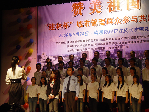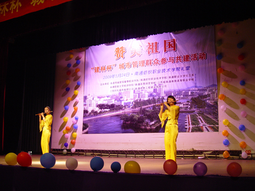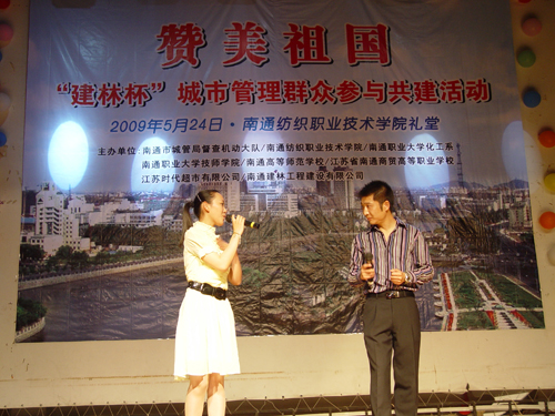5月24日下午,由市城管局主办,江苏时代超市有限公司、南通建林工程建设有限公司赞助,我校以及职大、纺院、商贸共同参与的 “赞美祖国‘建林杯’城市管理群众参与共建活动文艺演出”在南通纺院大礼堂隆重举行。我校副校长陈情作为特邀嘉宾、团委书记魏荣华作为评委前往参加活动。赵伟璐同学担任主持,并且和市城管局赵曦同志合唱了一首《因为爱》。管灵珊同学的女声独唱《公仆赞》、范雪君和袁敏丹同学的竹笛合奏《江南好》等艺体系团总支选送的节目将演出推向了一个又一个高潮,受到观众的一致好评。最终,我校囊括了歌唱类节目第一、二名,乐器演奏也获得其他类节目第一名的好成绩。