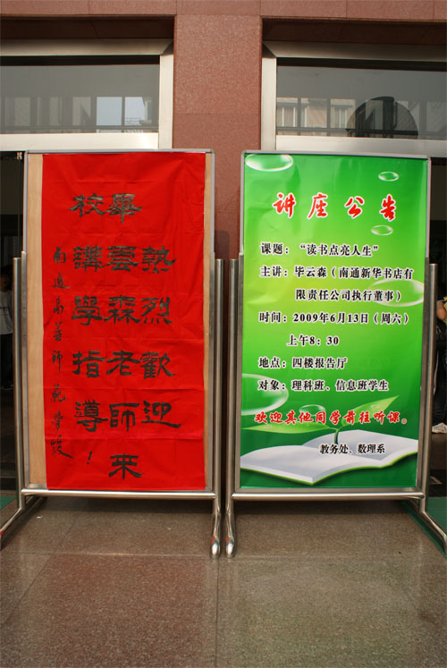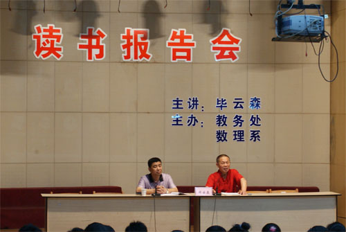 6月13日 上午,数理系和教务处邀请南通新华书店责任有限公司执行董事毕云森先生来我校作了题为“读书点亮人生”的读书报告。毕先生运用包括自己在内的许多典型事例论述了读书的意义和方法,生动具体、立意深刻。理科班和信息技术班全体同学听取了报告,并与毕先生进行了面对面的交流。同学们表示,报告进一步加深了他们对读书意义的认识、唤起了他们的读书热情,他们将努力多读书、读好书,要用读书点亮人生!