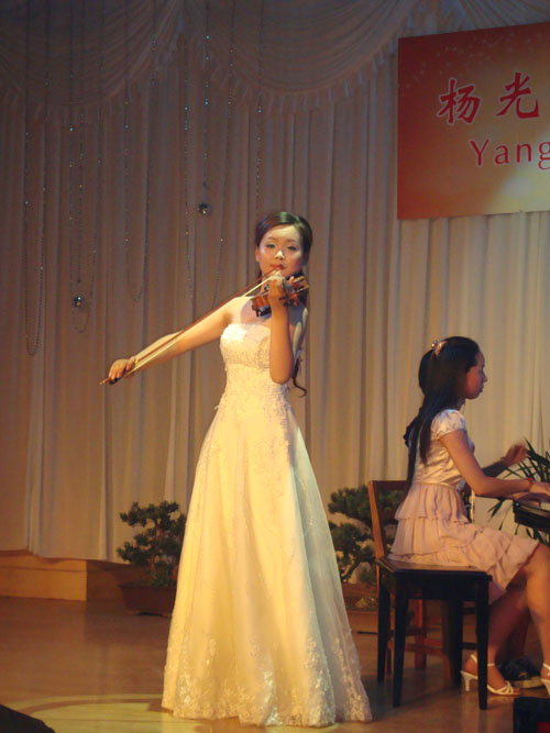6月18日晚上,一首《贝多芬小提琴奏鸣曲》拉开了我校艺体系05级(1)班杨光同学小提琴专场音乐会的帷幕。该场音乐会,杨光同学共演奏了10首小提琴曲,其中包括中国民歌、外国歌曲。音乐时而慷慨激昂,时而行云流水。中场时杨光还为大家带来了动感十足的电子小提琴表演,赢得了现场观众的阵阵掌声。