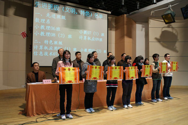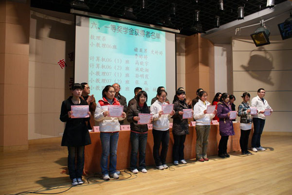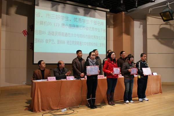 3月22日下午,数理系各班集中在综合楼四楼报告厅召开了2009~2010学年度第一学期表彰大会。会议由陆永来副主任主持,陈建副主任宣读了表彰决定:小教理06、小教理07(1)、小教理08(2)、计算机应用09获“先进班级”称号,计算机应用06(1)、小教理07(2)、信息技术07获“特色班级”称号,授予王伟琴等22名同学“优秀学生干部”称号,授予陆陈媛等75名同学“三好学生”称号,授予王佳丽等97名同学“单项优秀生”,授予褚亚男等10名同学一等奖学金,授予杨雯雯等20名同学二等奖学金,授予姜春燕等49名同学三等奖学金;卞晓丽、施丽燕(信息05)、单尹艺、顾潇霏、陆陈媛(小教理05)、唐小晶(计算机应用05)、褚亚男、史婷婷(小教理06)、袁施春(信息06)获得国家励志奖学金;计算机05唐小晶同学获得省级“优秀学生干部”称号,信息05汤雄同学获得南通市大中专院校市级“优秀学生干部”称号,小教理05单尹艺、小教理06褚亚男两位同学获得南通市大中专院校市级“三好学生”称号。孙国春副校长、教务处吴剑峰处长、学工处倪健处长、团委魏荣华书记、系主任徐汝成、陈建、陆永来、系团总支书记羌玲玲老师向受到表彰的班级和个人颁发了奖状。理科06班李婷婷同学代表所有获奖学生发言。最后,徐汝成主任在讲话中要求所有同学争当先进,科学安排时间,刻苦钻研,用实际行动实现自己的人生理想。表彰会在雄壮的校歌声中结束。