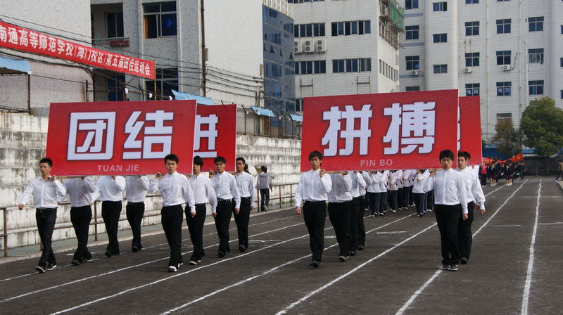 海门校区运动会分4个参赛组别,设16个比赛项目,共有31个(师范部11个、中学部24个)代表队的685名运动员同场竞技。大会以“团结、拼搏、奋进、图强”为宗旨,以“强健体魄,提升素养”为目标。比赛中,运动员们奋力角逐,发扬胜不骄、败不馁的竞赛作风;裁判员们尽职尽心,体现了严肃认真、公平公正的体育精神;啦啦队员们全心投入,展示了热情似火、激情如潮的青春风采。经过两天的激烈比拼,最终,高一(1)班、高二(8)班、艺体系美术06班、艺体系体育07班分获甲、乙、丙、丁组团体总分第一名,高一(2)、高二(8)、英语09(2)班、体育06班等16个代表队喜获“精神文明运动队”的荣誉称号。