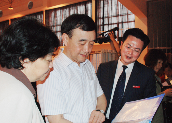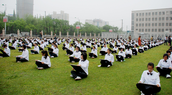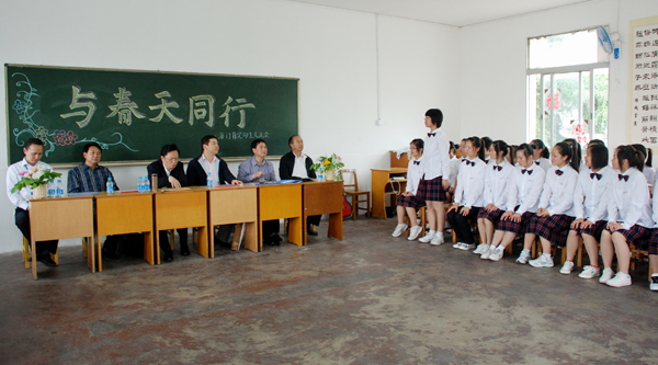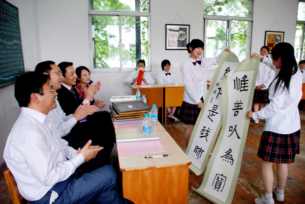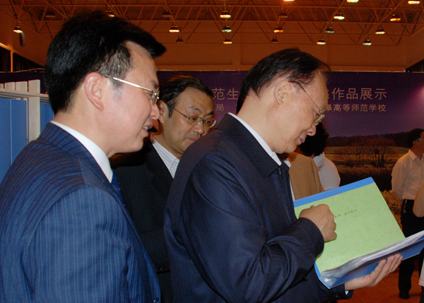 9点05分,我校在操场上举行了隆重的迎宾仪式。300名同学用一首《迎宾颂》,用激情洋溢的朗诵,表达了对省市各界领导、来宾的欢迎,并拉开了汇报的帷幕。与此同时,300名定向生进行了现场板书的表演。巡视途中,王湛部长仔细观摩,亲切垂询,当得知眼前进行表演的是刚入学8个多月的一年级孩子时,赞不绝口,感叹到:“10年、20年之后,这批孩子必将是南通基础教育界的骨干”。随后,领导、来宾移步体育馆,观摩题为“开花的土地”的学生静态作品展览。一幅幅书画、一件件手工,一盒盒台帐、一页页档案,记录了两所高师培养者的耕耘过程和学生们的成长印痕。