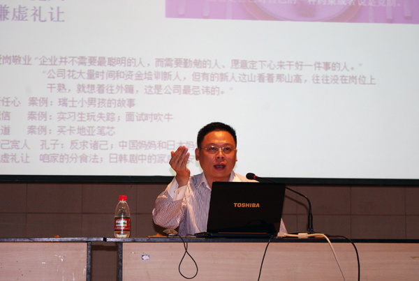 他以生动风趣的语言介绍了自己企业的发展状况,从一个社会人的爱岗敬业、责任心、忠诚、团结、律己宽人、谦虚礼让等品德要求,到专业能力及行业知识的掌握,对同学们一一提出了要求。他说:“企业并不需要最聪明的人,而需要勤勉的人,愿意定下心来干好一件事的人。”他举了很多生动的例子说明一个人的责任心和诚信对于一个职场中的人有多么重要。他认为现代企业需要的是复合型人才,应有较强的语言能力、组织能力、应变能力、驾驶技术、电脑技术和摄影技术等,同时人的情绪智慧对于一个人的成功也起着至关重要的作用。