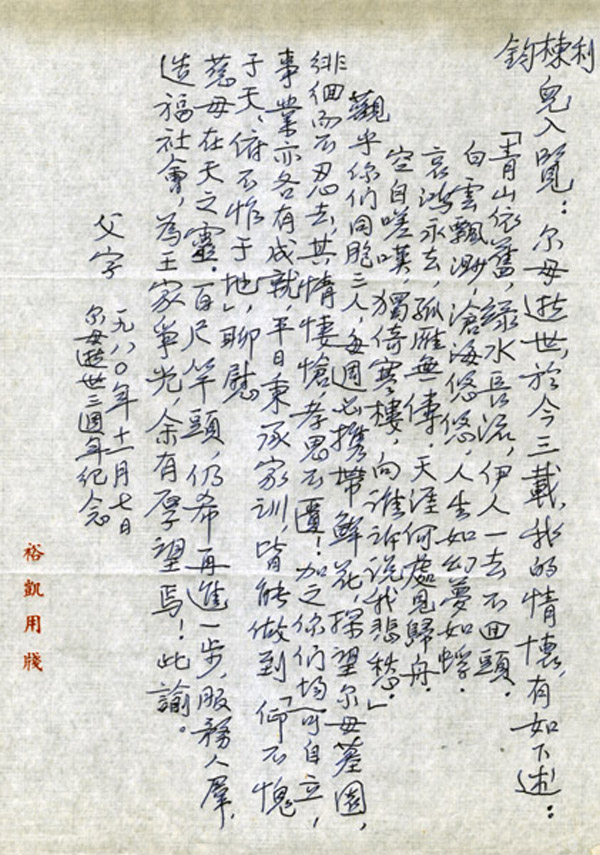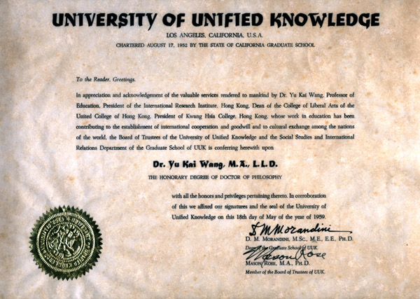 日前,我校接美国洛杉矶王成栋先生来函,随函捐赠了其父王裕凯先生的珍贵资料。王成栋先生是著名华裔教育慈善家,曾担任著名跨国经济集团3M公司和开利公司的总裁,其父王裕凯先生是我校第十九届师范本科毕业生并曾留校担任过舍监,上世纪三四十年代参与创办大夏大学、光夏学院等高等学府的创建工作,抗战期间曾任东吴、之江、圣约翰、沪江联合大学教务长,是著名华人高等教育家。今年5月,王成栋先生随美中工商协会世博访问团到南通考察,期间专程到我校参观、座谈。王先生在离校前曾表示:回到美国后,要把家中他父亲的生平资料全部寄给南通高师校史馆,如果有可能,还会与学校展开教育方面的合作。此次随函捐赠给校史馆的有关王裕凯先生的材料有:1952年8月17日 洛杉矶公立大学授予王裕凯荣誉哲学博士学位证书原件,王裕凯先生写给子女的遗嘱,以及两张照片原件。这些都是珍贵的校史材料。