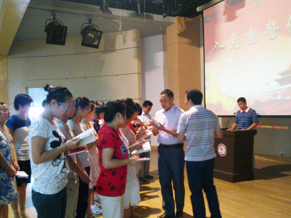7月14日 上午,学生工作第一、第三支部在南通校区联合举行新党员入党宣誓仪式,20名新发展的学生预备党员在鲜红的党旗下进行了庄严的宣誓。两个支部全体支委、培养人、部分党员和学生入党积极分子参加了宣誓活动,外语系倪蓓君老师、05信息班严振同学和小教07文科(1)班许庆同学分别代表培养老师、新党员和入党积极分子发言。