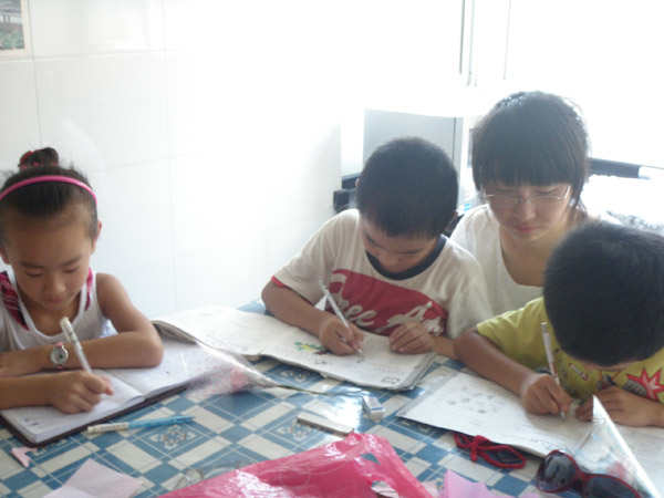 活动当天,同学们提前进入准备状态,等待孩子们的到来。虽然天气比较闷热,但他们还是迎来了10多位小朋友的笑脸。考虑到参加活动的孩子不是很多,年龄水平参差不齐,并且针对留守儿童的特殊性,开展了暑假作业和手工制作康乃馨的辅导。