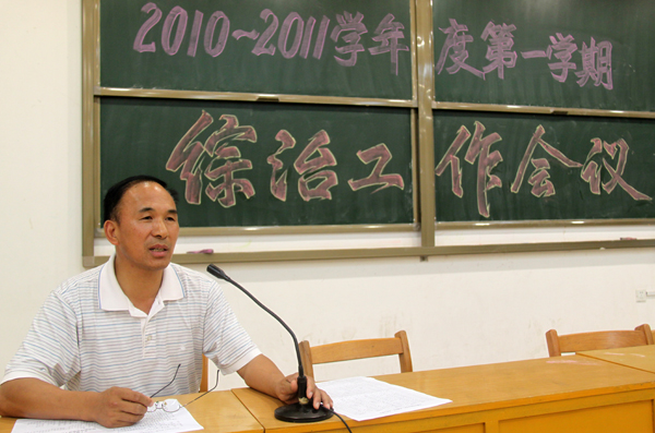 9月15日 下午,校长室召集全体值班干部、班主任老师和校园保安召开召开综合治理工作会议,部署本学期的安全工作并对值班人员重申值班要求。