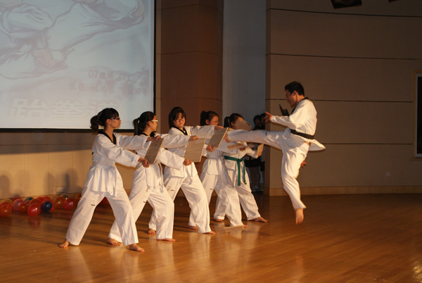 面对社会发展的多元化,让每一名同学在学校生活中找到自己的位置已成为数理系德育工作的共识,而学生风采展示为同学们提供了彰显个性、展现自我的舞台。本次活动有撼人心灵的手语操、动感劲爆的爵士舞、幽默搞笑的相声小品、神秘莫测的魔术、惊险刺激的跆拳道,有多项基本功的展示,有小提琴、钢琴、古筝、乐队演奏,有小合唱、连唱等,节目形式丰富,精彩纷呈,台上与台下一起互动,高潮迭起。理08(1)、理09(2)、计算机07班的手语操表演,舞蹈与手语巧妙结合,动作细腻流畅,感情真挚流露,手语之美尽显其中;计算机10班张奇伟同学在舞蹈《Chris Lee》中,用动感的旋律、炫酷的舞姿点燃了全场观众的激情,获得了如雷的掌声;最刺激的节目就是跆拳道了,理07(1)等班级的同学将平日的训练成果搬上舞台,以快、准、狠的功法表演了飞身、空翻踢断木板等,让台下的观众惊叹连连;在现场书法、简笔画、黑板报展示及魔方比赛中,同学们扎实的职业基本功赢得了阵阵喝彩。