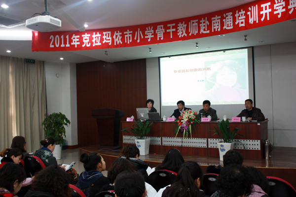 新疆克拉玛依市小学骨干教师南通挂职培训班3月20日上午在南通师范二附小举行开学典礼。41名来自祖国边陲的小学语文、数学骨干教师风尘仆仆,齐聚南通,将进行为期一个月的在定点学校挂职学习和集中培训。这也是我校培训部门近两年来承担的第三批新疆克拉玛依市中小学教师挂职培训任务。市教育局王笑君副局长、师资处茅慧生处长出席了开学典礼,市中小学教师研修中心办公室负责人主持了会议。会上,徐汝成主任解读了培训实施方案,对培训目标、培训内容方式及培训组织管理进行说明。王笑君副局长代表市教育局欢迎克拉玛依市骨干教师到我市学习,对两市基础教育的合作和共同提高提出了真诚的希望,他还热情地介绍了南通地域风貌和南通实施素质教育教育的做法,要求培训机构与学习教师共同努力,高质量地完成培训任务。