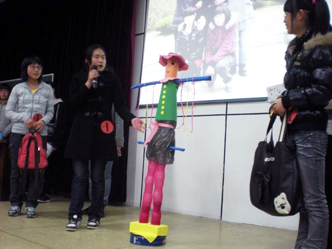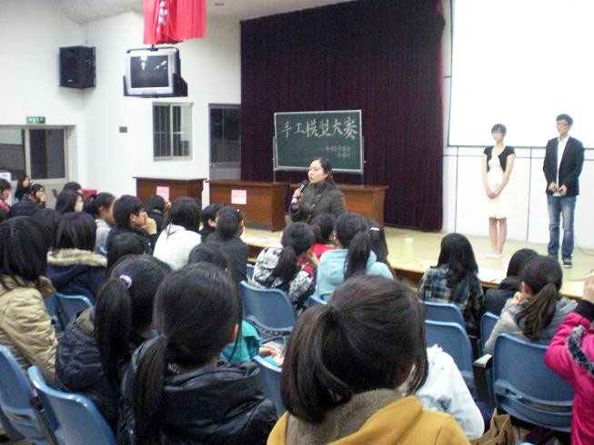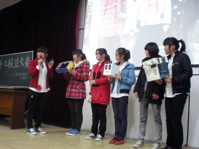 参加比赛的共有来自08级和09级的11个班级。活动共分为三组,每组4个班级,每组比赛20分钟。每一位参赛选手都给我们展出了优秀的作品,比如挂衣架、垃圾盒子、美观又实用、洒水车、靠垫……新奇又大方,令人惊叹的是,一个由废旧纸的桶以及易拉罐做的环保小台灯,给在场的老师和观众留下了深刻的印象。