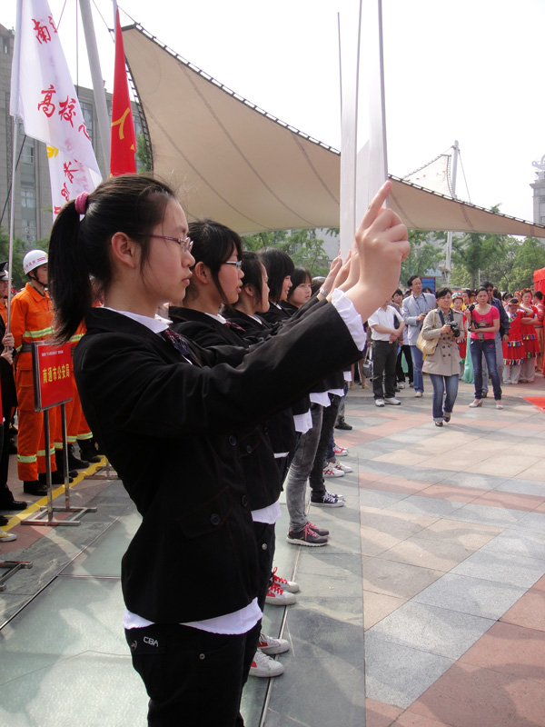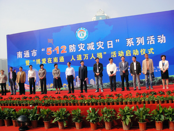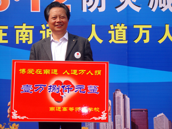 5月12日 是个特别的日子。在汶川地震三周年之际,南通市红十字会在环西文化广场隆重举行了“5.12防灾减灾日”活动暨“博爱在南通 人道万人捐”活动。陈情副校长作为我校红会会长和我校30多名志愿者全程参加了本次活动。