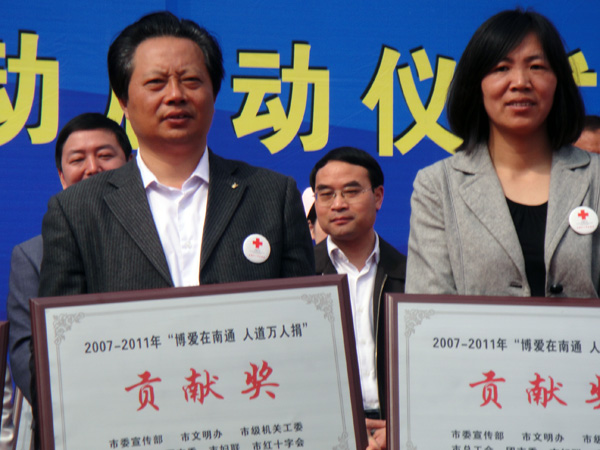 在市领导致辞和“首届南通市应急救护大赛”启动仪式之后,陈情会长上主席台接受了由市委宣传部、市文明办、市总工会和市红十字会等部门联合颁发的2007~2011年“博爱在南通 人道万人捐活动”贡献奖牌,并在现场代表我校红十字会举牌向市红会捐助善款18000元,是2007年以来我校第五次向红会捐助特殊会费,充分体现了我校师生对公益事业的关注和源源不断的爱心奉献。