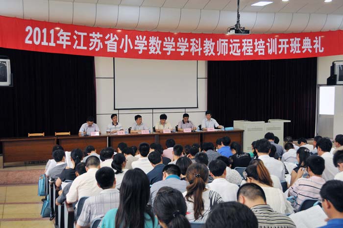 6月30日,由南通市中小学教师研修中心承办的2011年江苏省小学数学学科教师远程培训开班典礼在我校举行,出席会议的领导有市教育局王笑君副局长、教育局师资处茅慧生处长、南通高等师范学校潘健副校长、市教科研中心丁锦华科长、市中小学教师研修中心办公室徐汝成主任等。会议由培训处处长助理冯建华主持,徐汝成主任对本次培训方案进行了解读,海门市实验小学杨惠娟主任代表学员和辅导员作了表态性的发言,最后王局长发表讲话,他指出本次培训既是省级培训,也是校本研修,两者合二为一,具有层次高、涉及面广的特点,他强调辅导员一定要以高度的责任心来对待本项工作,要管理到位、有效实施、加强考核,确保质量。要制定切实可行的培训计划,克服困难,确保每一位学员都能按时完成学习任务。通过培训要使全体受训教师在师德修养、新课程理念、课程改革的理论研究与实践探索能力、小学数学的教学素养与教研能力、专业发展水平等方面的综合素质得到进一步的提高。