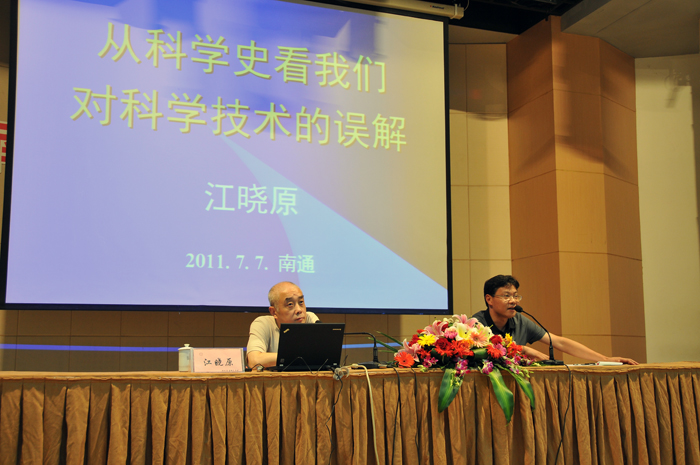 下午,上海交通大学教授、博士生导师江晓原题为《从科学史看我们对科学技术的三大误解》,把当天的活动推向了高潮。江晓原教授从现实生活的许多实例入手,站在批判“科学主义”的立场,揭示了科学史上对科学技术存在的“科学等于正确”、“科学技术能解决一切问题”、“科学是至高无上的知识体系”等三大误解。对于“科学”的认识,江教授的很多见解给大家耳目一新、振聋发聩的感受。用副校长潘健在总结时用的词来说是一种“颠覆”。互动部分江教授还热情地回答了老师们提出的有关“手机辐射程度”、“核电站危害性”以及“科学能否吞下科学自身酿造的苦果”等问题。整场报告充满着幽默的话语、智慧的光芒和思辨的力量。