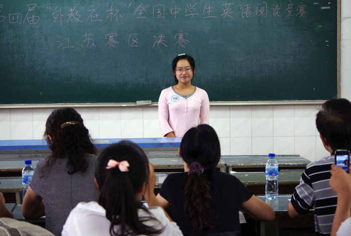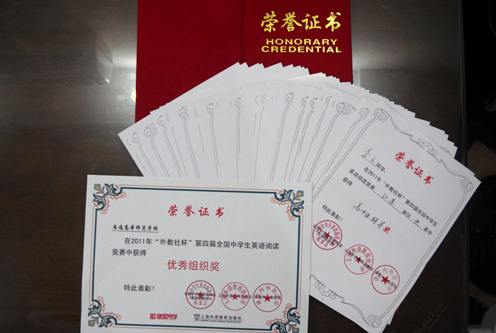 在刚刚结束的的2011年“外教社”第四届全国中学生英语阅读竞赛江苏赛区决赛中,我校英语08(2)班李文同学荣获特等奖,将直接晋级参加12月份的全国总决赛;英语08(1)班张昱同学荣获一等奖,英语08(1)班张金凤同学、英语08(3)班刘祝睛同学获二等奖,英语08(1)班张培同学、09英语(1)班宋佳、丁勖同学获三等奖;另有40多名同学获优胜奖。同时,翟立、陈滢滢、王燕、 李放 老师被评为“优秀指导教师”,学校荣获“优秀组织奖”。