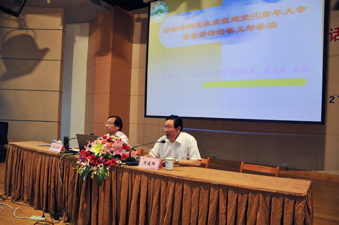 为深刻理解胡锦涛总书记“七一”讲话的基本内容和精神实质,进一步增强推动南通教育科学发展、跨越发展的自觉性和坚定性。 9月27日 ,市教育局邀请南通大学管理学院院长、硕士生导师臧乃康教授作学习胡锦涛总书记“七一”讲话专题辅导报告,报告会在我校报告厅举行。