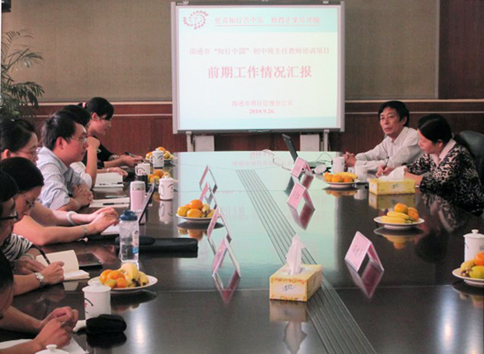 南通市项目办张国强主任首先代表南通市项目团队向省调研组汇报了南通市前一阶段项目工作的进展情况。作为连续两年获得“知行中国”培训项目国家级优秀团队的南通市,今年共有7个县区、776名初中班主任教师参与“知行中国”项目培训,面对时间紧、任务重、压力大等各种各样的困难,南通项目团队依靠各级教育行政部门强有力的领导,依靠上级项目管理机构和项目专家的正确引领,依靠全体指导教师和管理员的忘我工作,依靠全体参训学员的刻苦努力,高扬“为伊消得人憔悴”的精神,按照“ 东方欲晓君行早”的策略,“咬定青山不放松”,“不待扬鞭自奋蹄”,自觉学习、自我加压、自主图强,在前一阶段的项目工作中取得了令人振奋的成绩,各项培训数据和成果均在全国所有参训地市中名列前茅。截止9月25日 ,全市776位学员人均学时已经达到1162分钟,人均作业8.89条,人均其他各类网上交流68.9次,并基本完成了互动项目“清零”任务;全市已建三人行网络班级693个,占总参训人数的89.3%,其中通州、如东、海门实现了建班“百分百”;全市已在研修网首页展示学习成果47项,提前实现了班班有成果、项项有成果的既定目标,并有3位学员被研修网评为“今日之星”,有3位学员被研修网聘为相关专栏的教研员。与此同时,南通市还与新疆自治区伊犁、吐鲁番、哈密、阿克苏、喀什、伊巴音郭和克拉玛依等7个地州初步达成了手拉手结对学习协议。