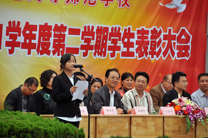 会上,数理系小教理08(1)班朱鑫娟同学、人文系小教文07(1)班顾园园同学、外语系翟立老师分别作为优秀学生代表、先进集体代表和优秀班主任代表发了言。最后,丁兆雄校长作了重要而精彩的讲话,他鼓励全体同学,以先进集体、先进学生为追赶目标,坚苦自立、忠实不欺,强学力行、博见精思,用汗水浇灌成长的青春,用行动创造辉煌的明天。