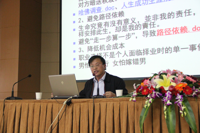 邓宏宝教授的讲座题目为《规划生涯,追求卓越》。讲座中, 邓教授从职业生涯规划的意义、步骤、目标的确定以及如何实现目标等方面让同学们明白了职业生涯规划的重要性,知晓了职业生涯规划的内容以及如何在今后的学习生活中通过规划实现自己的职业生涯目标,追求卓越的人生。邓教授的讲座深入浅出,贴近生活,贴近学生,让学生受益匪浅。