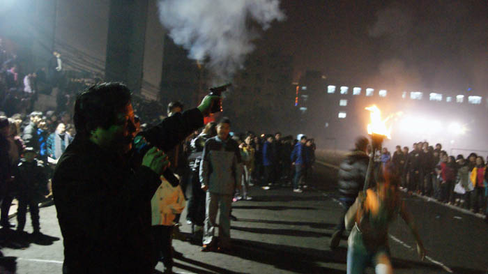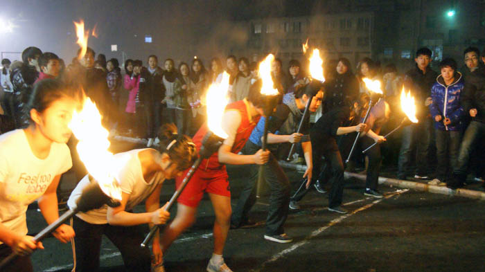 火炬接力赛比赛之前各班认真组织报名并认真组织训练;比赛当晚,由学工处副处长马文娟主持,学生代表讲话,副校长陈情宣布比赛开始;之后全体师生在陈校长和三位系主任的带领下,手持火炬绕场慢跑一圈。比赛期间,各班班主任亲自到场组织,参赛运动员克服了各种困难,以饱满的热情在赛场上奋力拼搏,尊重裁判,崇尚“友谊第一,比赛第二”的体育精神。最后英语09(2)班、英语11(1)班和体育09班分别获得甲、乙、体育班组第一名。