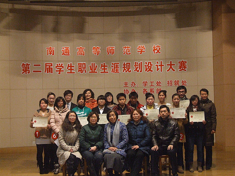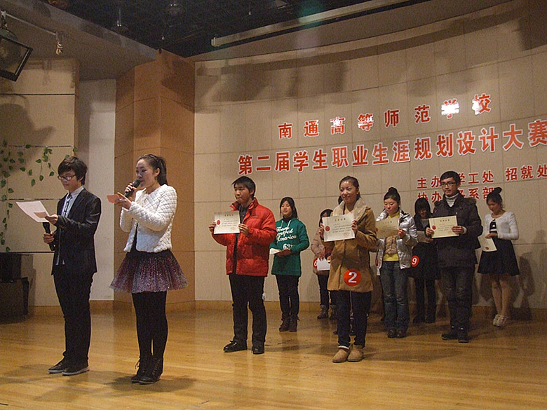 12月27日 下午进行的总决赛分为三个环节:个性展示、计划书陈述、才艺表演。选手自信、乐观的表现和参赛时较强的应变能力给评委和观众留下了深刻的印象。最终,旅游英语08班顾珏榕、计算机09班管旭获职业生涯规划设计金奖;小教文09(2)班费天宇、学前08(2)班朱旭、英语08(5)班邵金尧、美术09(2)班顾葛胜获职业生涯规划设计银奖;小教文09(2)班王帅、小教理08(2)班王榆香、陆苏苏,旅游英语08班葛烽丽、美术08班王家丽、美术09(2)班陆茜茜获职业生涯规划设计铜奖。