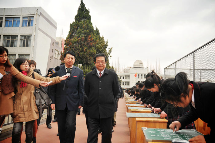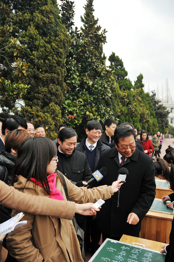 教育部、省、市各级领导视察,正值我校举行一年一度的“世纪走笔”规范字现场书写大赛。300多名师范生围着操场跑道,书写着粉笔字。刘利民副部长一行饶有兴致地观看了比赛,并对师范生的基本功赞不绝口。几次停下来,询问孩子们的学习情况和未来的打算。