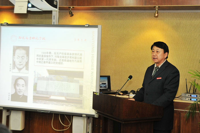 在专题汇报活动中,丁兆雄校长代表学校向莅临的各级领导汇报了我校的办学历史和文化传统,以及贯彻、实施国家、省、市《中长期教育改革和发展规划纲要》的情况。随后,刘利民副部长发表了重要讲话。他说:“通过这一天多的考察(上午参加海门中学校庆,刚刚在通师二附调研),我觉得南通市委、市政府是真正地把教育摆在了优先发展的战略地位,所以南通高师率先实行免费师范教育在全国是不多见的。”