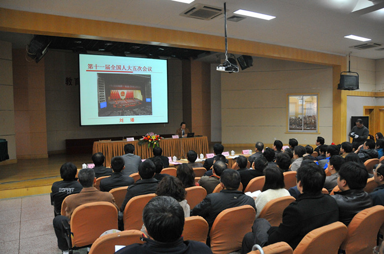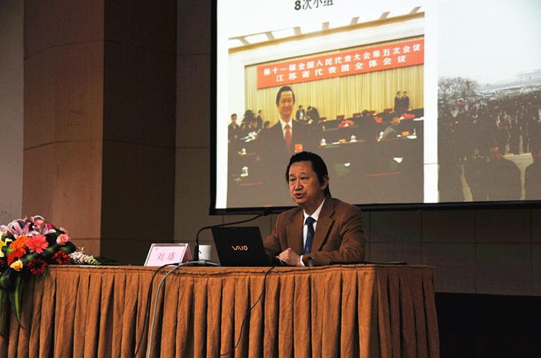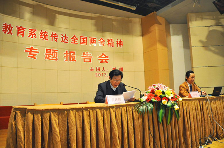 为了深入学习贯彻全国“两会”精神,市教育局于 3月30日下午 在我校举行传达“两会”精神专题报告会,特邀全国人大代表、市人大常委会副主任、致公党南通市委主委刘璠教授,为大家作传达“两会”精神的专题辅导报告。市教育局党组理论学习中心组成员、机关全体同志和直属学校(单位)理论学习中心组成员听取了报告。