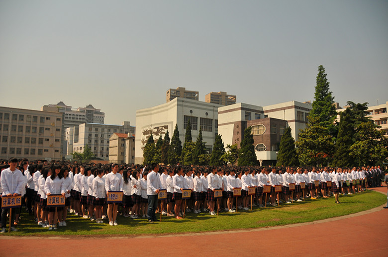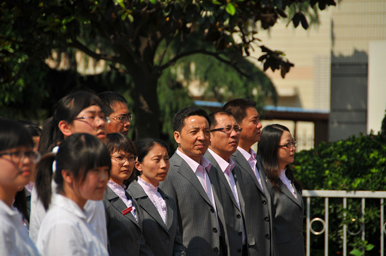 8点40分,副校长潘健宣布仪式开始。随着雄壮、昂扬的国歌和校歌,国旗和校旗冉冉升起。随后,副校长陈情宣布了学校110校庆徽标、歌词征集评选的结果。接着,按照艺体系美术10(1)班张煜茜同学设计的110校庆徽标制作的校庆旗,通过升旗的形式第一次呈现在全校师生面前。