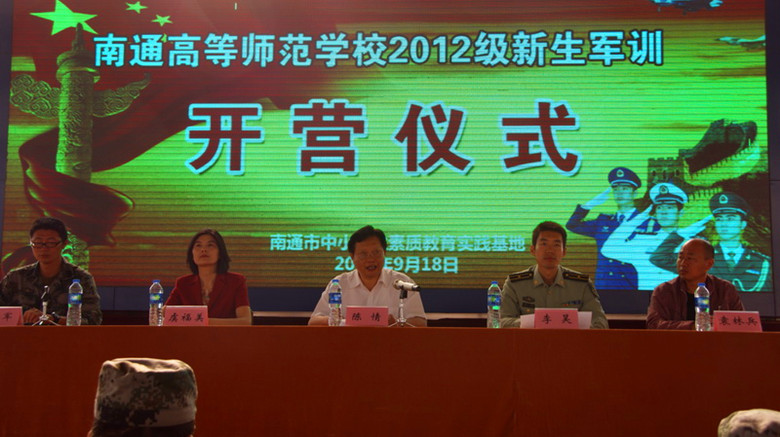 9月18日上午8点,伴随着雄壮的国歌声,我校2012级新生开营仪式在如东南通市中小学素质教育实践训练基地举行。826名新生在这里将参加为期七天的全封闭正规化的军事知识学习和军事技能训练。学校副校长陈情、学工处副处长虞福美、实践基地副主任潘袁林兵、大队长李昊少校等领导出席开营仪式。陈情校长在仪式上希望全体同学提高认识,积极参与,塑造高师学子新形象;尊重教官,服从管理,提高军训工作质量;团结互助,注意安全,确保军训有序开展。希望全体班主任、相关工作人员各司其职、规范而严谨做好服务工作,通力协作,高质量的完成本次军训暨入学教育工作。