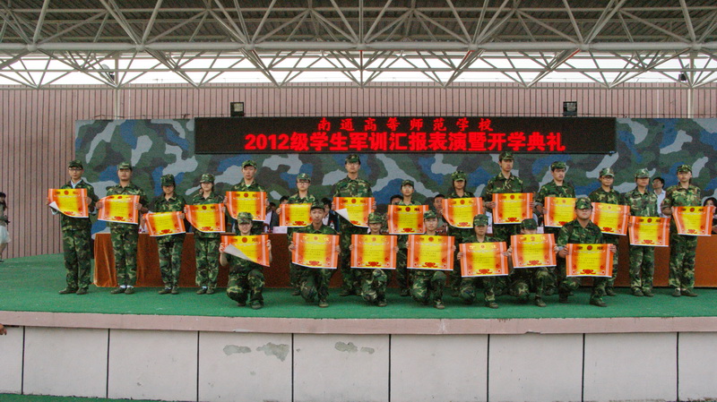 会操表演结束后,陈情副校长代表学校宣布了《关于南通高等师范学校2012级新生军训优秀学员的表彰决定》和各中队综合评比成绩,与会领导向获奖的集体和个人颁发了奖状。