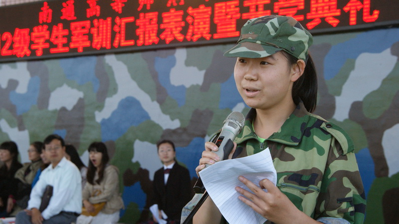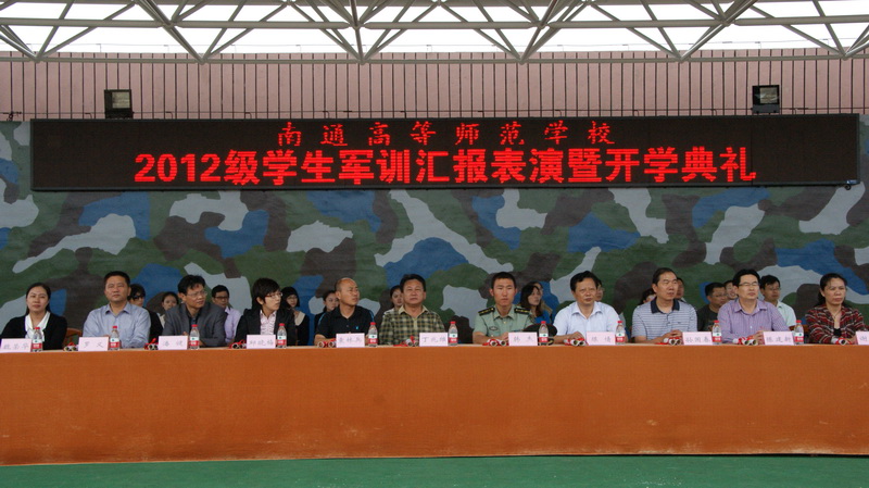 9月22日下午在如东南通市中小学素质训练基地操场隆重举行了通高师2012级学生军训成果汇报暨结营典礼。校长丁兆雄,副校长陈情、潘健、孙国春,各系、办负责人,中国人民解放军理工大学李昊少校,军训基地袁林兵主任,以及我校2012级近900名新生出席了典礼。学工处副处长虞福美主持典礼仪式。