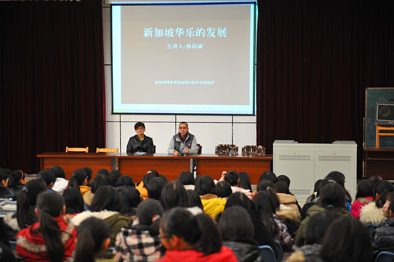 期间,维多利亚初级学院师生观摩了我校艺体系器乐的上课现场,并与我校师生进行了亲切友好的交流,就专业教学问题进行了深入探讨。林向斌指挥为我校音乐专业的师生奉上了精彩的讲座——“新加坡华乐的发展”,拓展了我校师生的国际视野。