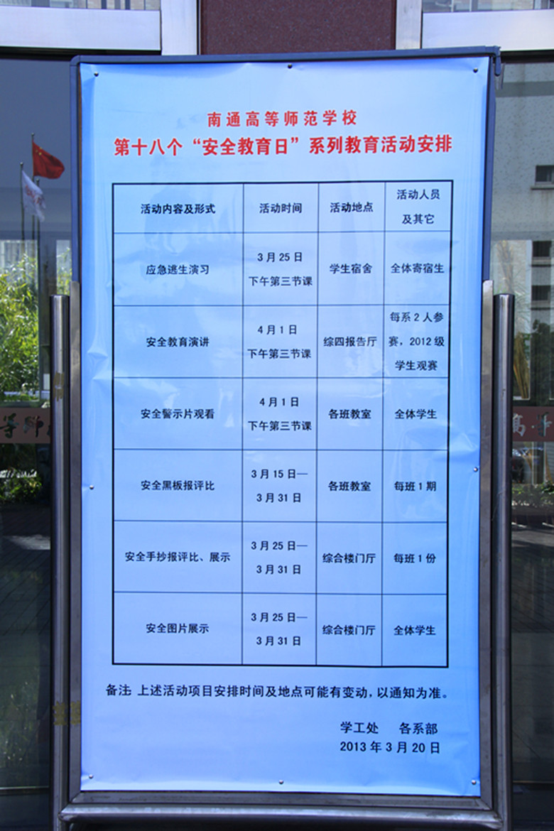 3月份是我校安全教育月。为有效开展各种教育活动,不断提高师生的安全意识和应对突发事件的避险自救能力,最大限度地预防和减少各种安全事故的发生,营造“人人讲安全,事事讲安全”的校园安全环境,学工处联合各系部制定了2013年“安全教育月及教育日”六大活动方案,包括宿舍区应急逃生演习、安全教育演讲、安全警示片观看、安全黑板报评比、安全手抄报评比和安全图片展示等并于近日组织实施。