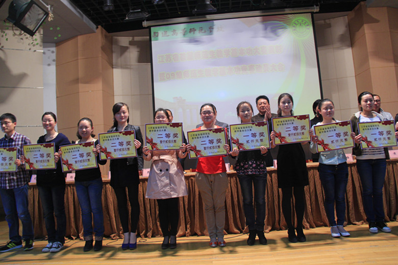 首先,孙校长宣读了表彰决定。在2012年举办的“江苏省首届师范生教学基本功大赛”中,我校08级11名参赛选手全部获奖,成绩名列前茅。其中,人文系的施文杰、数理系的朱鑫娟、外语系的潘思玮、李文等同学分获小学教育组一等奖,数理系的袁怡楠、外语系的刘雁林、许可、钱炜炜等同学分获二等奖,人文系的冯践知获三等奖;学前系的唐君妍、张媛媛分获学前教育组二等奖。为表彰先进,激励全体,学校对上述同学进行表彰,并给予一定物质奖励。对一等奖获得者奖励2000元,二等奖1200元,三等奖800元。同时,学校为有 关指导老师们颁发了荣誉证书。