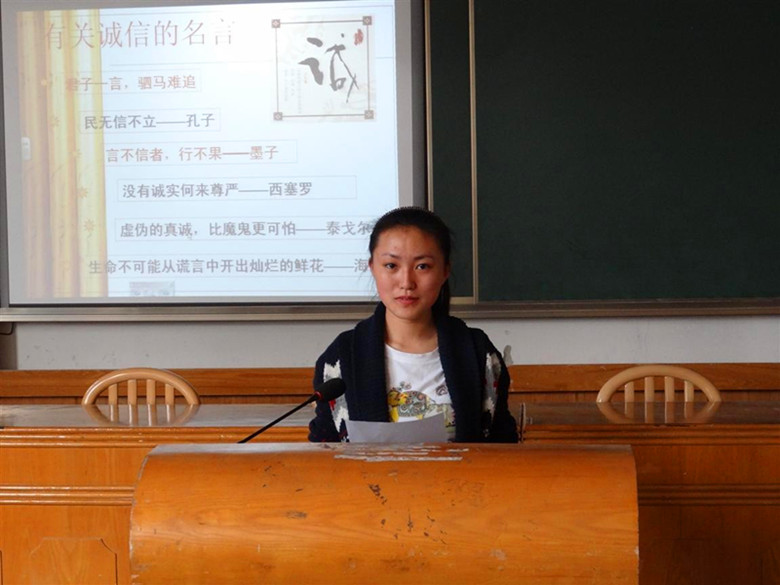 4月23日下午3:30,南通高师海门校区团委在综合楼二楼阶梯教室举办了诚信道德讲堂活动,通过唱歌曲、诵经典、听故事、表感悟等活动宣传诚信。本次道德讲堂由团委副书记马文娟主持,活动分四个环节,第一环节学唱歌曲《诚信中国》,第二环节经典诵读,第三环节观看宣传短片,第四环节学生表感悟。通过此次活动,使同学们深切体会到诚实守信的重要意义,明白了一些做人做事的道理,是一次很有意义的教育活动。