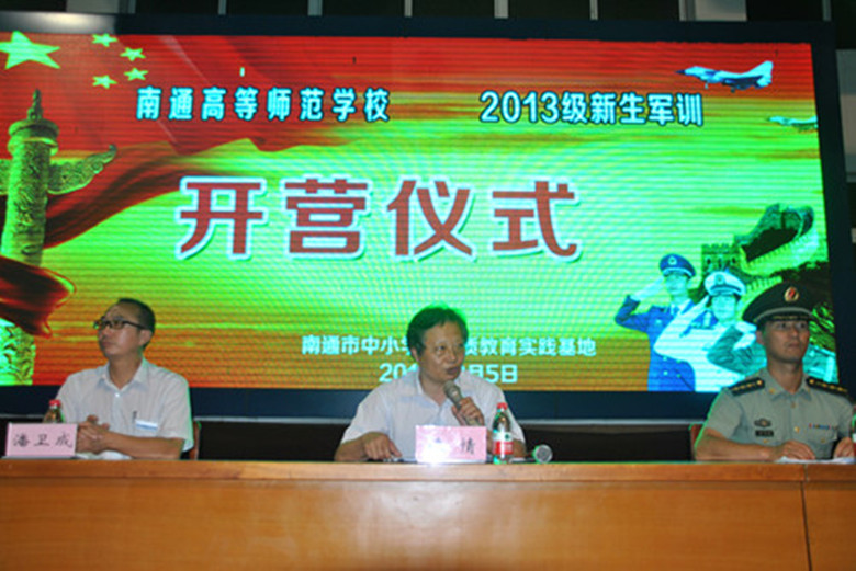 9月5日晚9点,伴随着雄壮的国歌声,我校2013级新生开营仪式在如东南通市中小学素质教育实践训练基地举行。801名新生在这里将参加为期七天的全封闭正规化的军事训练。副校长陈情、学工处副处长虞福美、实践基地主任潘卫成、大队长朱亚松上尉等领导出席开营仪式并讲话。