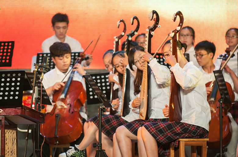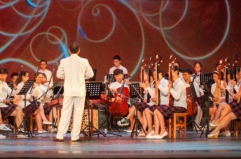 我校的民乐合奏《丰收锣鼓》、诗朗诵《教育的颜色》、合唱《回娘家》分别贯穿在整场演出的前中后三个重要位置,起到渲染气氛、烘托主题、掀起高潮的作用。在濠滨夏夜的大舞台上,我校同学尽情展示了昂扬向上的精神风貌和艺术教学的实践成果。