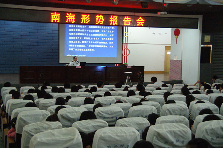 9月29日下午,海门校区报告厅座无虚席,全体学生凝神静气,聆听一身戎装的海军指挥学院副院长龚允冲少将的《南海形势与南沙精神》报告。