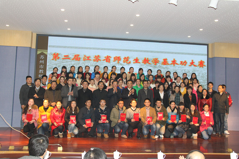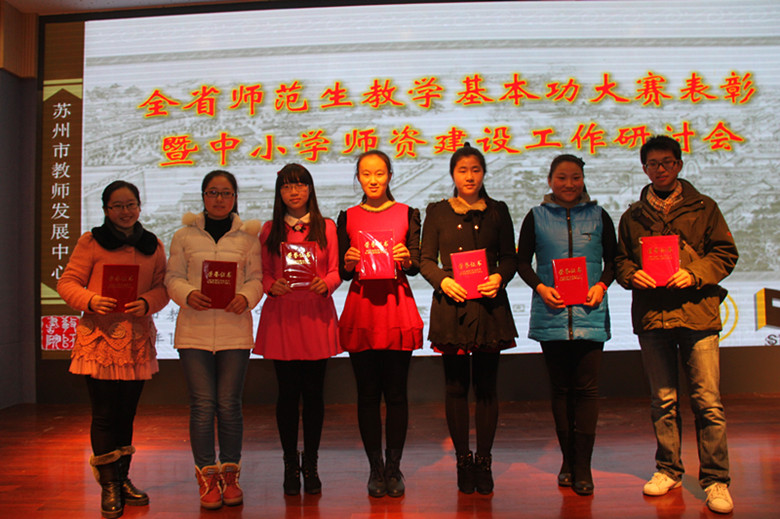 12月24日江苏省教育厅在苏州市教师发展中心举行了江苏省第二届师范生教学基本功大赛总结表彰大会。会议由省教育厅师资处调研员、省教科院副院级调研员樊增荣同志主持,省教师教育专业指导委员会主任、南京师范大学副校长潘百齐教授代表大赛组委会作了第二届全省师范生教学基本功大赛工作总结,南京晓庄学院张丹丹同学代表获奖学生作了专题发言,省教育厅杨湘宁副厅长作了重要讲话。我校孙国春副校长、教务处吴剑峰处长率7名一等奖获奖学生参加了表彰大会。