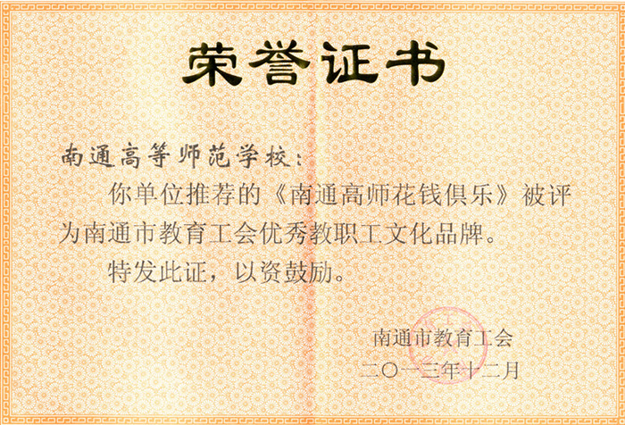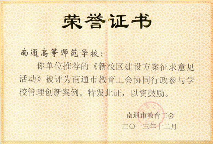 去年以来,我校工会获得南通市教育工会多项表彰,主要有:《新校区建设方案征求意见活动》被评为南通市教育工会协同行政参与学校管理创新案例;《南通高师花钱俱乐部》被评为南通市教育工会优秀教职工文化品牌;沈行恬同志的绘画作品被评为南通市教育系统“康乐金秋”书画摄影比赛绘画类一等奖;翟立、张旭被评为南通市“青蓝工程”优秀师徒。