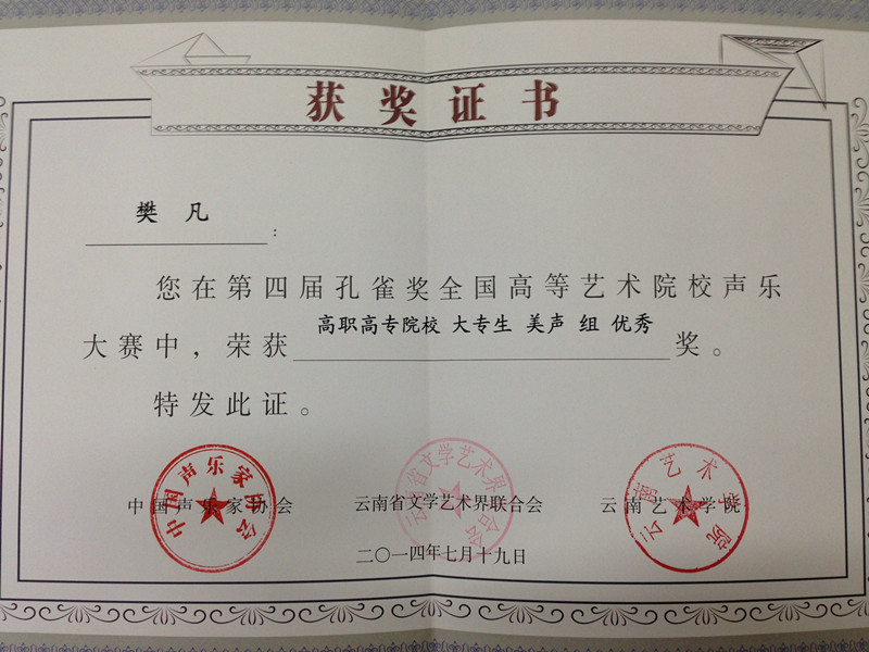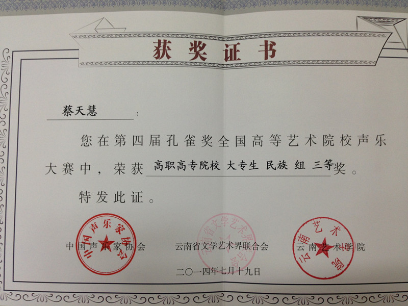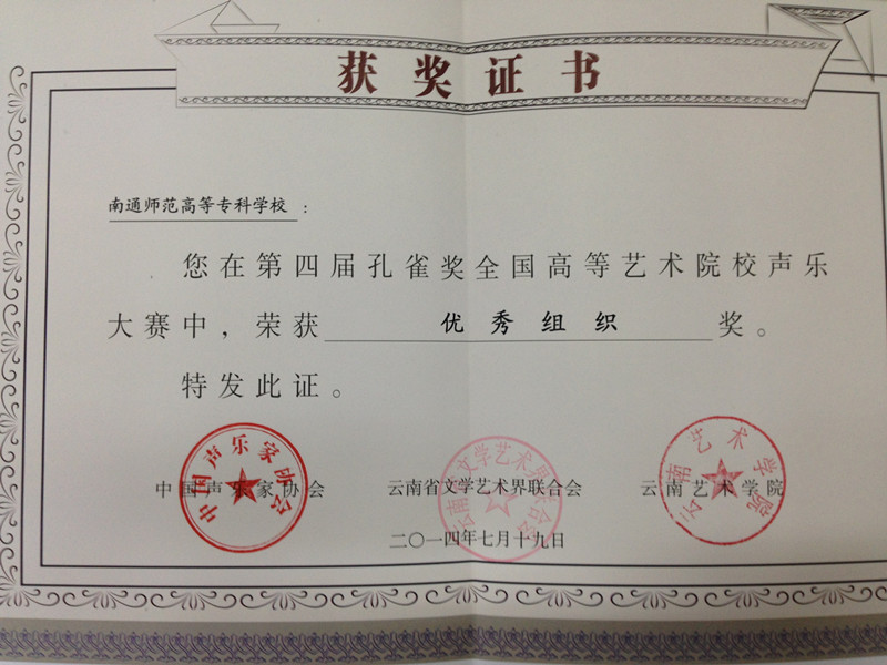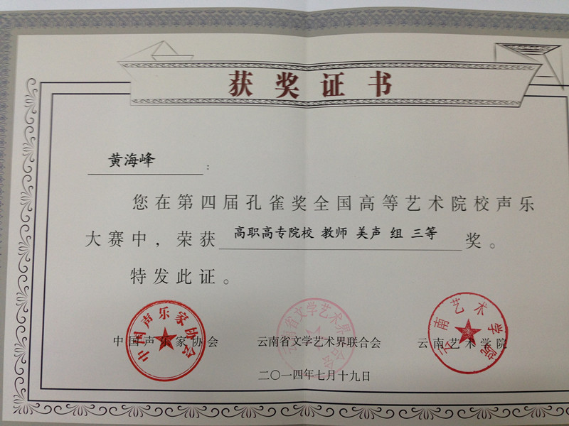 由中国声乐家协会主办的第四届孔雀杯全国高等艺术院校声乐大赛中我校师生组队参加了比赛,黄海峰老师获得高职高专院校教师美声组三等奖,蔡天慧获得高职高专院校大专生民族组三等奖,樊凡获得高职高专院校大专生美声组优秀奖,同时我校获得优秀组织奖。