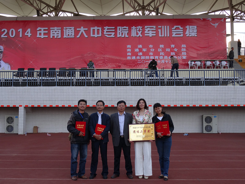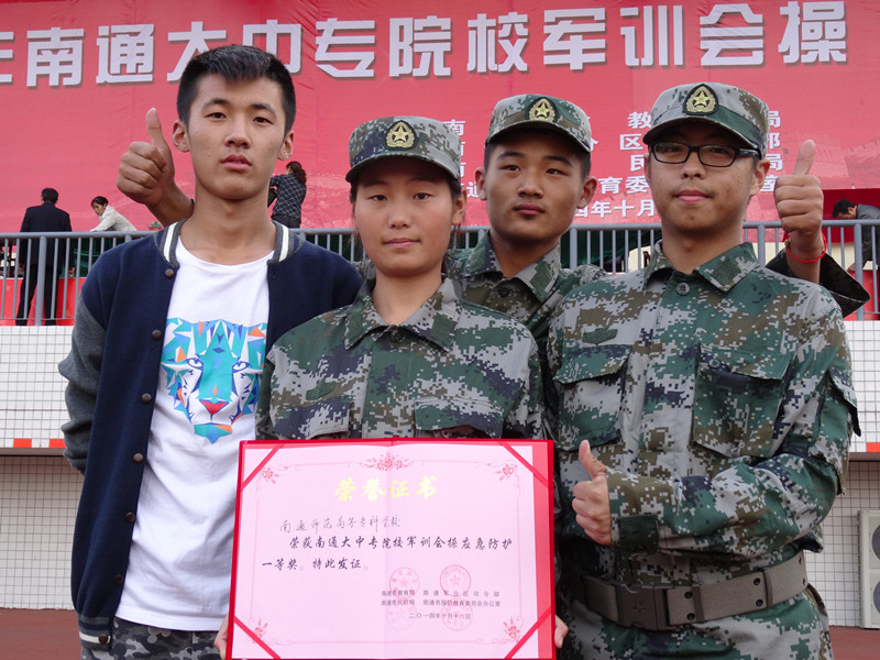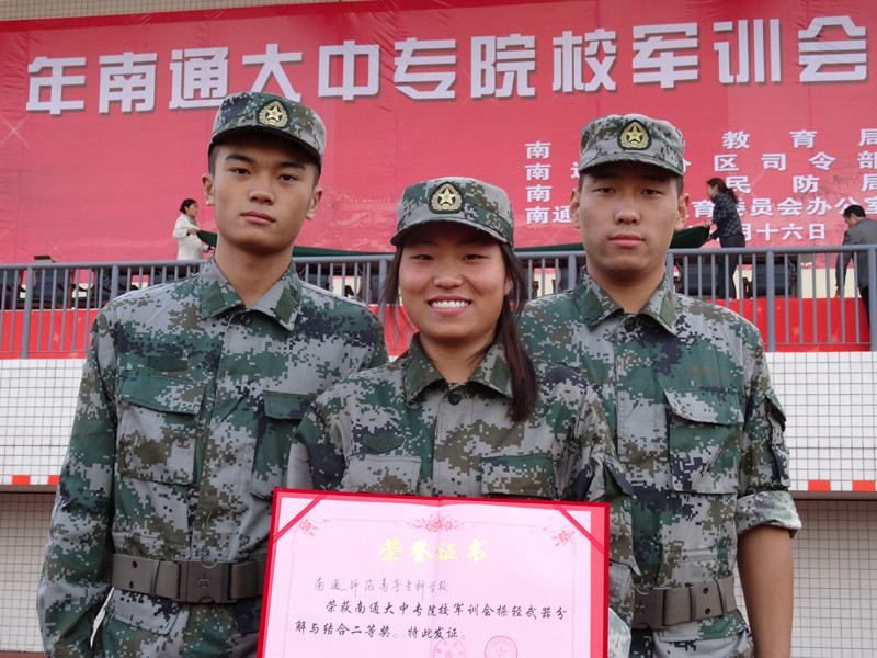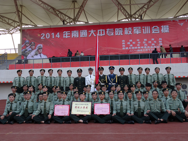 在10月16日举行的南通大中专院校学生军训会操中,我校2014级新生代表队喜获军训 “阅兵式和分列式”、“战地救护”两个单项一等奖,“轻武器分解”、“战斗精神队列歌曲”两个单项二等奖,并获会操团体比赛二等奖。