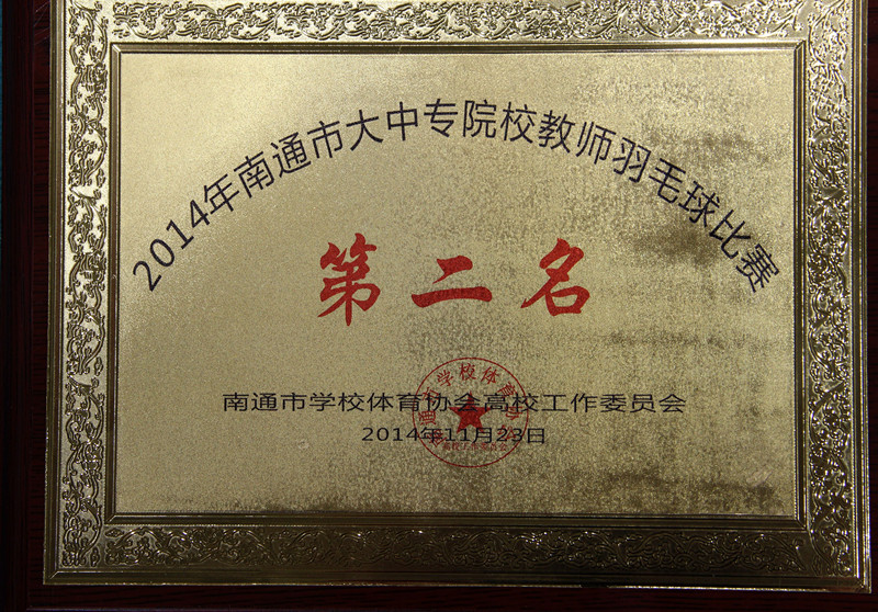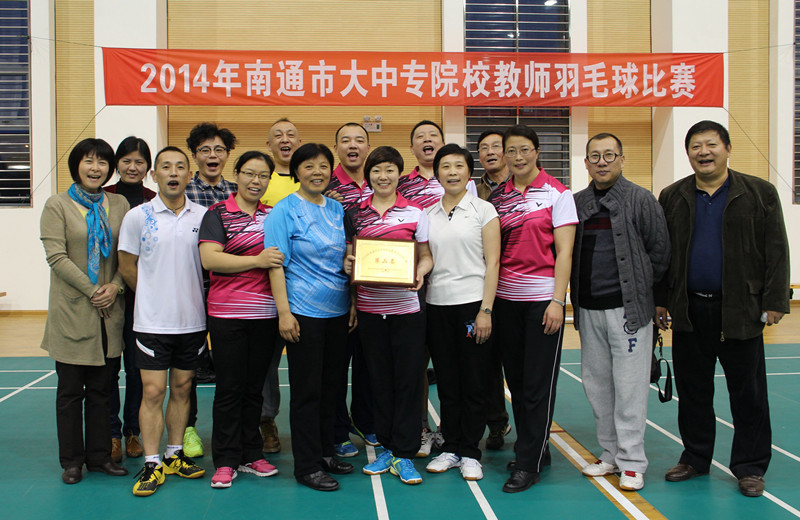 2014年11月23日南通市大中专院校教师羽毛球比赛在南通大学体育馆落下帷幕,全市10所院校分别配队参加比赛。为了备战本次羽毛球赛,我校在层层选拔的基础下,认真训练,精心准备,比赛中发扬拚搏精神,取得了第二名。