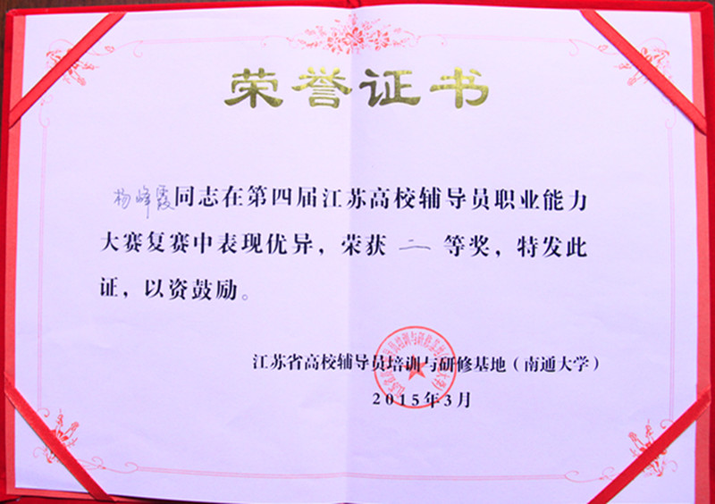 在刚刚结束的第四届江苏高校辅导员职业能力大赛中,我校人文系杨峰霞老师获得二等奖第一名。此次大赛的选手来自南通职业大学、南通航运职业技术学院、苏州职大、苏州经贸职业技术学院等在内的17所高职院校。赛程历时三天,设有笔试(基础知识测试和博文写作)、主题班会、案例分析、主题演讲和谈心谈话等五个环节,总计500分。经过激烈的角逐,杨峰霞老师以420.4分获得总成绩第三名。这是我校第一次参加该项赛事,获此荣誉,充分显示了我校班主任老师的知识技能和职业素养。
